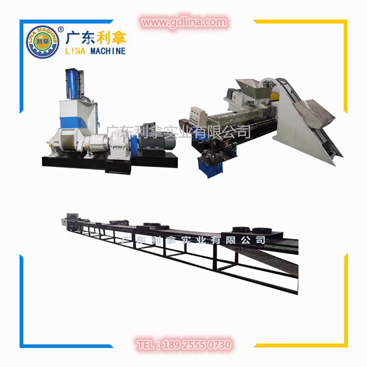 3、改性造粒機:為造粒主機,其功能是將密煉機混煉好以后的膠料經(jīng)過二次分散推送至切粒模頭切粒,因在推送過程中需要保證膠料的溫度所以一般設有五個溫度控制區(qū),用以調節(jié)膠料溫度配合切粒機切粒成型;